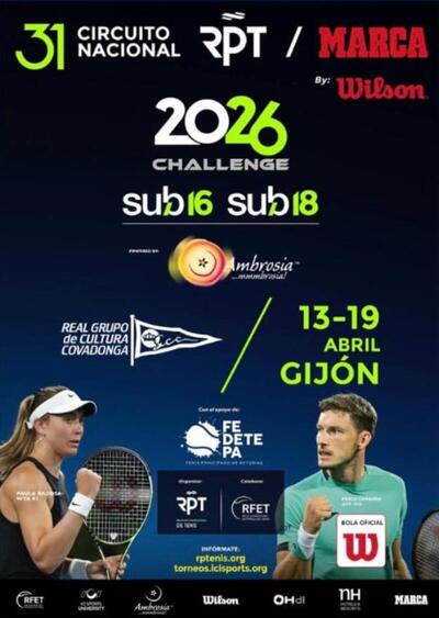 Las magníficas instalaciones del Real Grupo de Cultura Covadonga, en Gijón, acogieron con éxito la novena prueba del Circuito Juvenil RPT - Marca by Wilson powered by Ambrosía 2026, con las categorías juveniles Cadete Sub16 y Junior Sub18, del Circuito Juvenil más longevo del tenis español, que este año celebra su trigésimo primer aniversario, organizado por el Registro Profesional de Tenis.